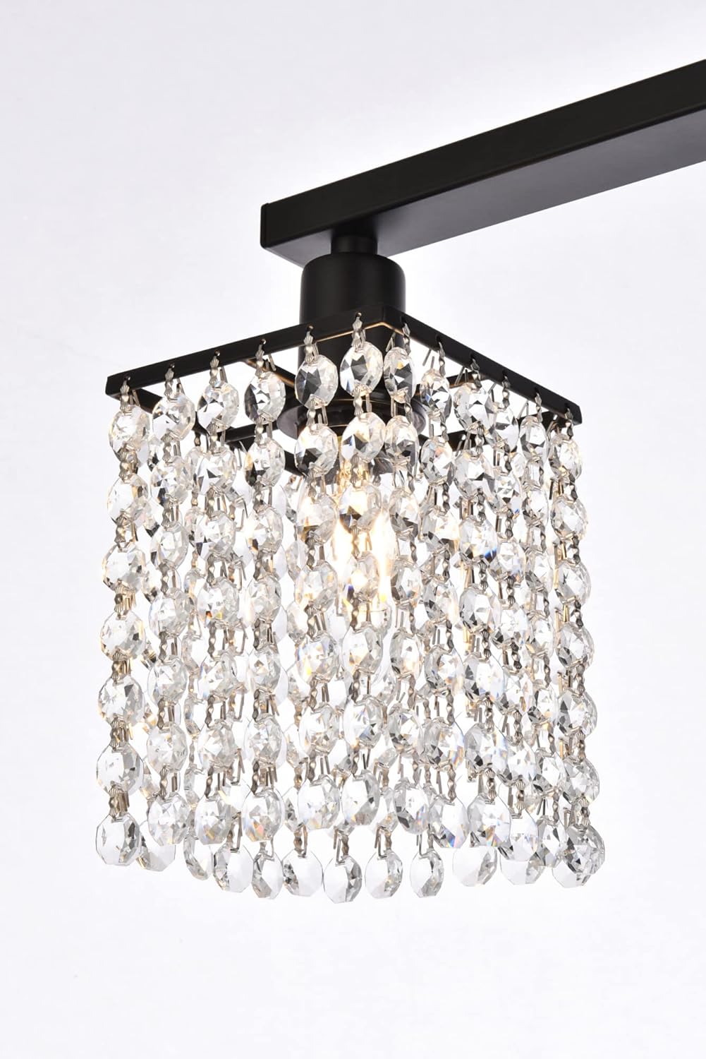 Phineas 3 Light 24" Wide Bathroom Vanity Light with Clear Royal Cut Crystals Product Specifications: SKU: LD7010BK Finish: Black Manufactured By: Elegant Lighting Backplate Depth: 4.8 in. Backplate Height: 4.8 in. Backplate Width: 0.8 in. Extension: 5.8 in. Height: 8.4 in. Nominal Width: 24 in. Product Weight: 3.76 Width: 24 in. Bulb Included: No Shade: Yes Swing Arm: No Bulb Base: Candelabra (E12) Bulb Visible: Yes Characteristics: Crystal Cord Color: Black, White Crystal Color: Clear Crystal Type: Royal Cut Dimmable: Yes Fixture Shape: Rectangle Full Backplate: No Genre: Mid-Century Modern LED: No Light Direction: Down Lighting Material: Crystal, Iron Number of Bulbs: 3 Number of Light Source(s): 3 Reversible Mounting: No Shade Color: Clear Shade Material: Crystal Shade Shape: Rectangle Smart Home: No Theme: Transitional, Industrial, Midcentury, Geometrics Vintage Edison Bulb: Yes Power Source: Hardwired Voltage: 120 Voltage Type: Line Voltage (110-120V) Wattage: 120 Watts Per Bulb: 40 ADA: No Certifications: ETL, UL Collection: Phineas Country Of Origin: China Energy Star: No Location Rating: Dry Location Manufacturer Warranty: 1 Year Limited Title 20 Compliant: Yes Title 24: Yes
