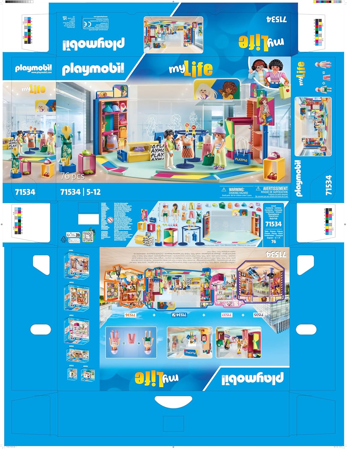 Embark on great shopping adventures with the modern fashion store from PLAYMOBIL. Clothing and accessories can be purchased, while new outfits are tried on in the fitting room and examined in front of the foot mirror. This set includes three PLAYMOBIL characters, a building with a sales counter, shopping bags, clothes rack and many dresses, shoes and hats for imaginative shopping games in the child's room. The different sections can be rearranged inside the fashion store as desired. All PLAYMOBIL My Life shopping sets can be combined and assembled to form a shopping centre.
