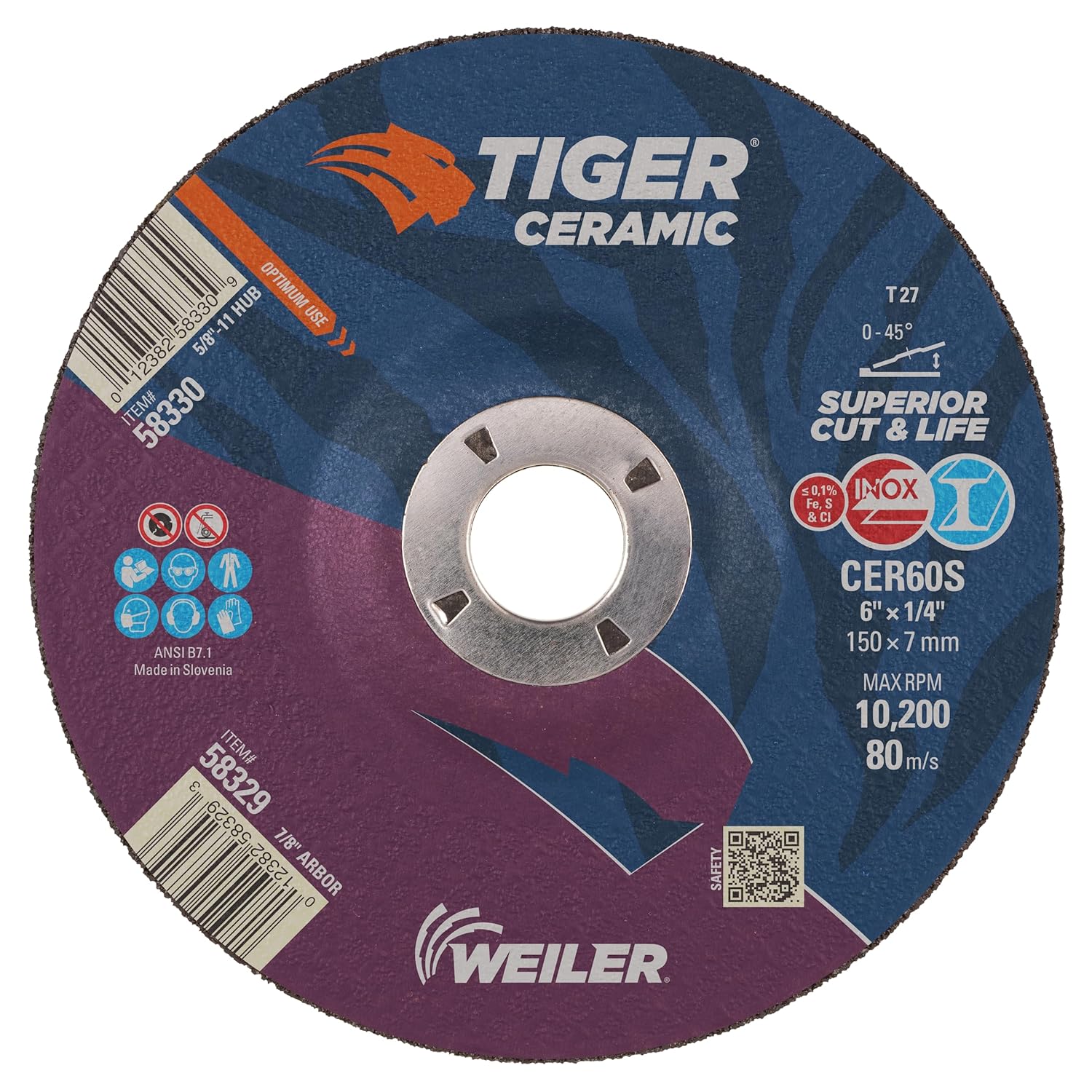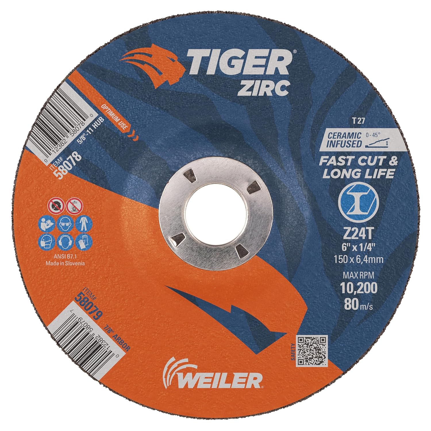 Weiler Wolverine 6 inch type 27 grinding wheels deliver a fast cut rate and consistent performance at a good value when grinding steel and other metals. Flat profile with depressed center allows for a wide range of grinding angles (0-45°) with a right angle grinder. Ideal for heavy stock removal, scale removal, weld removal, weld blending, edge beveling and torch-cut softening. The 7/8" open arbor offers a cost-effective mounting option when using adapting nuts.