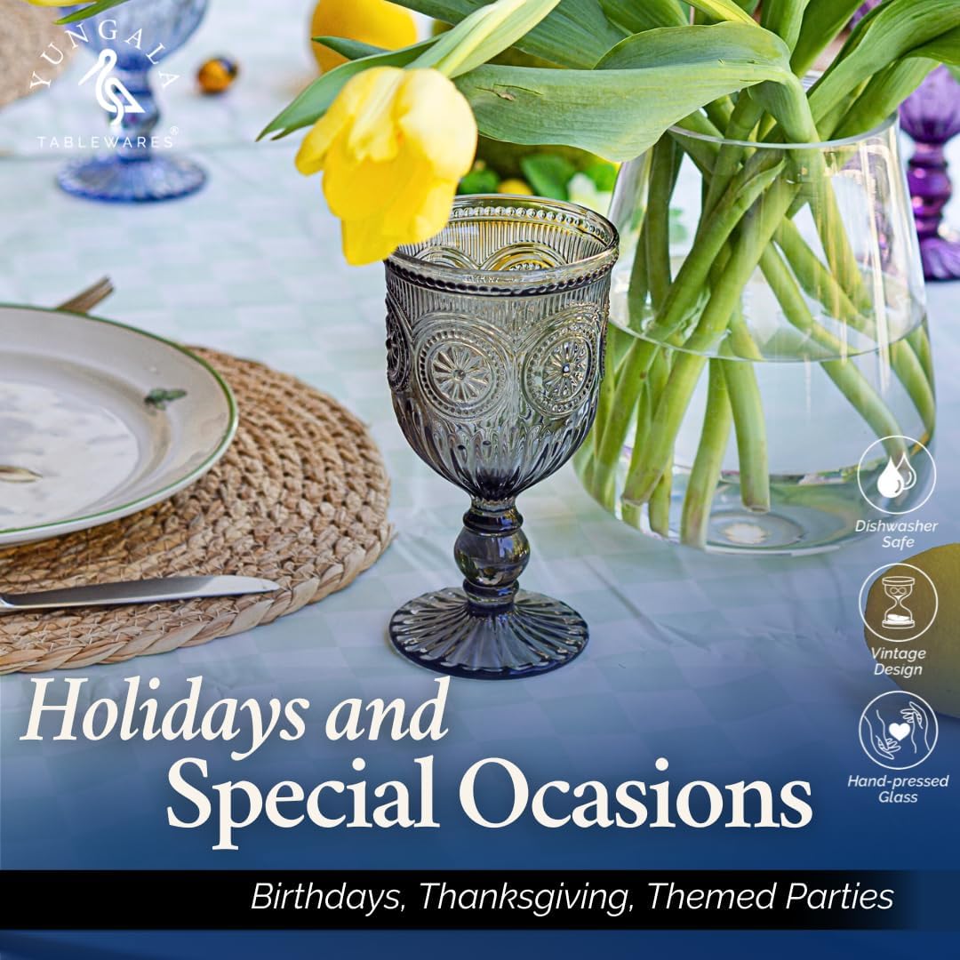 The Yungala bundle is a collection of high-quality Smokey wine glasses and Smokey Black Highball Glasses are made of durable smokey blackglass that is resistant to fading, peeling, and chipping. The plates feature a charming hobnail design, while the glasses are adorned with an elegant sunflower-inspired pattern. The chunky style of the glasses adds to their strength and makes them ideal for both everyday use and special occasions. The bundle allows for the creation of a romantic tablescape, and also you achieved and matching the blue glassware designs. Yungala offers a 100% satisfaction guarantee and a no-risk purchase policy, ensuring a worry-free buying experience for customers.